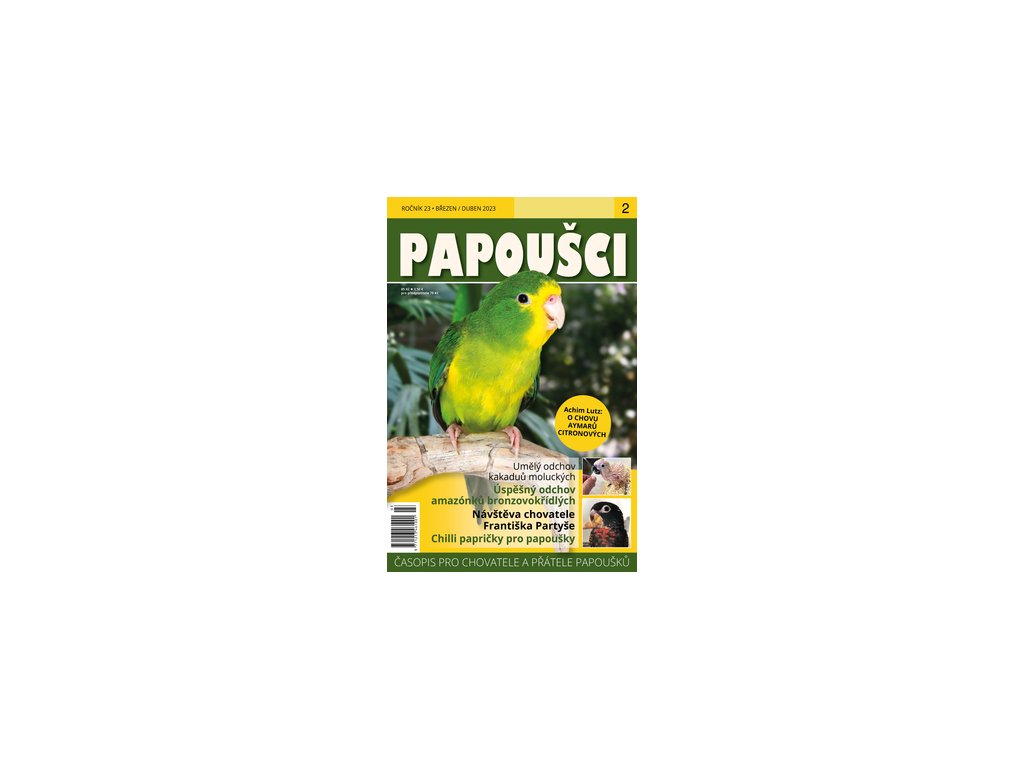 Papoušci č.2 - březen/duben 2023. Časopis PAPOUŠCI je jediným českým specializovaným periodikem zaměřeným pouze na papoušky. V jednotlivých rubrikách si přečtete zajímavé informace o praktickém chovu papoušků, výživě a krmení, chovu mutací, ručním odchovu, voliérách nebo nemocech papoušků. Najdete zde i články o papoušcích – domácích mazlíčcích, informace ze života papoušků ve volné přírodě nebo reference o činnostech nadací, které podporují projekty pro ochranu papoušků.