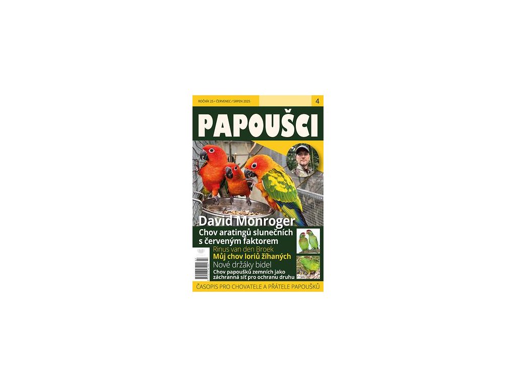 Papoušci č.4 - červenec/srpen 2025. Časopis PAPOUŠCI je jediným českým specializovaným periodikem zaměřeným pouze na papoušky. V jednotlivých rubrikách si přečtete zajímavé informace o praktickém chovu papoušků, výživě a krmení, chovu mutací, ručním odchovu, voliérách nebo nemocech papoušků. Najdete zde i články o papoušcích – domácích mazlíčcích, informace ze života papoušků ve volné přírodě nebo reference o činnostech nadací, které podporují projekty pro ochranu papoušků.