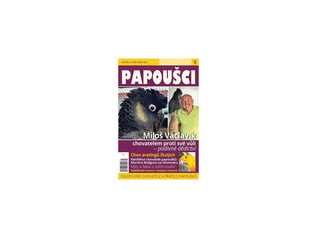 Papoušci č.5 - září/říjen 2025. Časopis PAPOUŠCI je jediným českým specializovaným periodikem zaměřeným pouze na papoušky. V jednotlivých rubrikách si přečtete zajímavé informace o praktickém chovu papoušků, výživě a krmení, chovu mutací, ručním odchovu, voliérách nebo nemocech papoušků. Najdete zde i články o papoušcích – domácích mazlíčcích, informace ze života papoušků ve volné přírodě nebo reference o činnostech nadací, které podporují projekty pro ochranu papoušků.