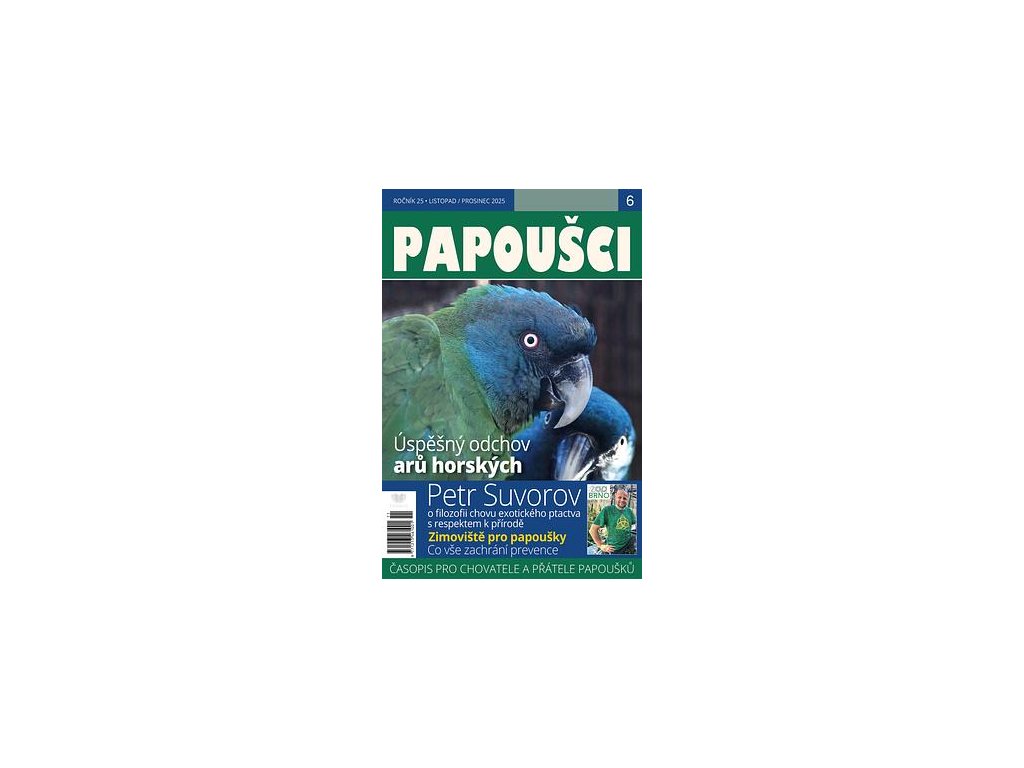 Papoušci č.6 - listopad/prosinec 2025. Časopis PAPOUŠCI je jediným českým specializovaným periodikem zaměřeným pouze na papoušky. V jednotlivých rubrikách si přečtete zajímavé informace o praktickém chovu papoušků, výživě a krmení, chovu mutací, ručním odchovu, voliérách nebo nemocech papoušků. Najdete zde i články o papoušcích – domácích mazlíčcích, informace ze života papoušků ve volné přírodě nebo reference o činnostech nadací, které podporují projekty pro ochranu papoušků.
