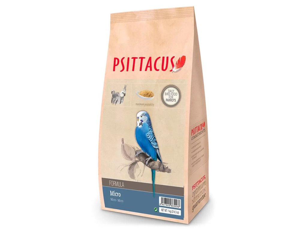 Psittacus MICRO je kompletní 100 % vyvážené krmení pro andulky a malé papoušky. Při krmení 70 % denní dávky touto směsí by neměly být dodávány žádné vitamínové doplňky. Každé sousto je maximálně nutričně vyvážené a odpovídá nárokům a potřebám papoušků. Zamezuje se tak upřednostňování jednotvárného podílu krmiva. Při krmení suchou směsí se minimalizuje odpad a snižuje spotřeba.