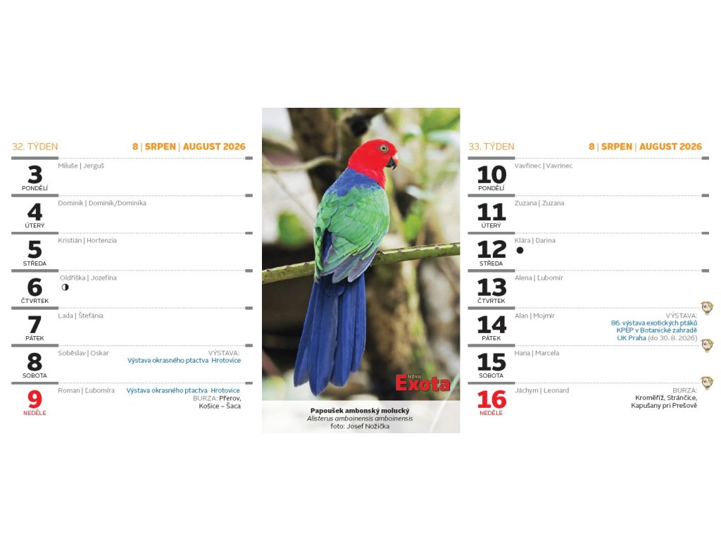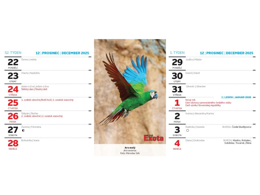 Stolní kalendář 2025 pro chovatele exotického ptactva s termíny chovatelských burz a výstav v České republice, na Slovensku a v zahraničí.